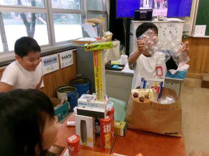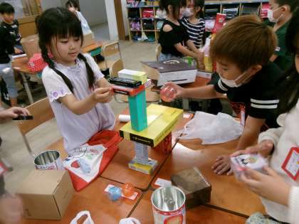 空き箱や空き缶などを使いながら、動物や車をつくりました。