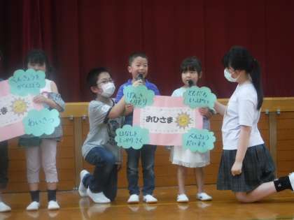 全校集まって、あかしやタイムが行われました。今日は、クラス目標の発表です。各クラスで話し合った目標を、代表の子が、しっかり発表してくれました。その目標を達成できるよう、また、クラスで励んでいきたいと思います。