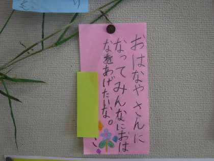 7月7日の七夕まで、もう少し。そこで、短冊に願い事を書きました。「やきゅううせんしゅになれますように。」「みずにかおをつけられますように。」など、みんなの願いがいっぱい込められていました。願いが叶いますように。