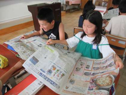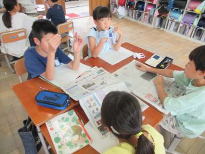 国語科では、「新聞を作ろう」という単元に入っています。自分たちで新聞を作る前に、まずは本物の新聞を見て、わかりやすく伝えるための特徴を見つけました。子ども達にとっては日常であまり見る機会は少ない新聞ですが、興味深く読んでいました。