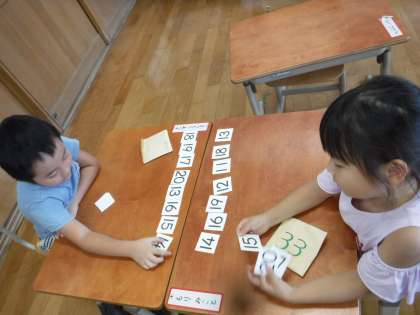 算数科では、「10よりおおきいかず」の学習をしています。0〜20までの数カードを並べたり、「10といくつ」かを当てるゲームをしたりしながら、20までの数について理解を深めています。来週からは、いよいよ20までの数の計算に入ります。