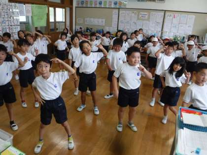 体育館参観で踊るダンスの練習が始まりました。1年生は「ダンスホール」の曲に合わせて、元気に踊ります。今日は初めてですが、一つ一つの動きを確かめながら、楽しそうに踊っていました。