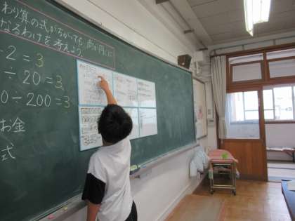 今日は、わり算の性質についてグループで考え、発表もしました。割る数・割られる数と商の関係について、自分たちで気づくことができていました。