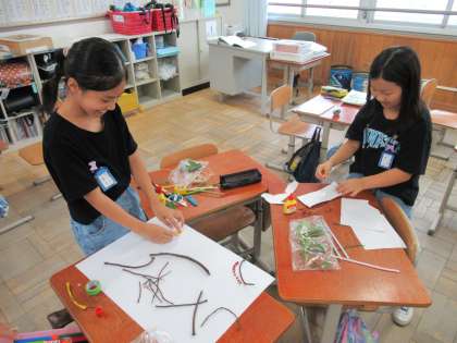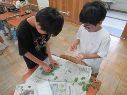 総合では、植物のパワーを周りの人たちにも伝えるため、植物を使って様々な取り組みをしています。自然豊かな朱四校の良さを生かし、葉っぱを使ったアートや色水づくりなどに励んでいます。