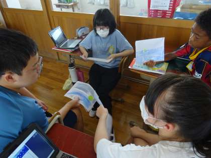 「やまなし」という物語文を学習しています。お話のあらすじを捉えるために、「五月」と「十二月」の場面を絵で表しました。グループで交流することにより、一人では気付かなかった表現などを確認することができていました。