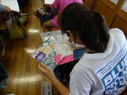 お話を聞いて、自分のすきな場面を絵に表しています。登場人物はどんな表情なのか、周りには何があるかなど、想像を広げて描いています。絵の具で着色するときには、背景をどのように色をつけるかなど、工夫していました。
