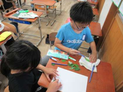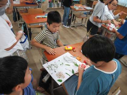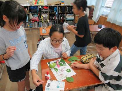 各グループで活動を進めています。葉っぱでアート作品を作ったり、花から色を抽出して色水を作ったり、どのグループも楽しみながら積極的に取り組んでいます。