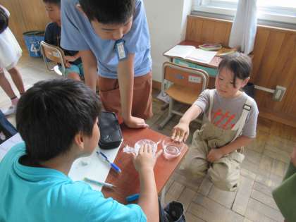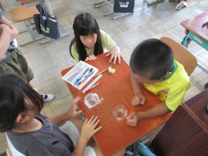 水は、そのまま置いておいたらどうなるのか教室で実験しています。前回に見た時より少し減っているものもありました。これからどうなるのか、楽しみにしている子どもたちでした。