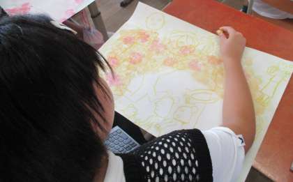 図画工作科の学習では、本を読んで心に残った場面を絵にしています。