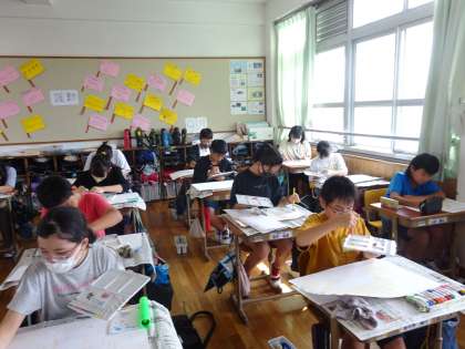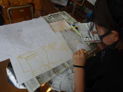 お話からイメージする色などを考えて、着色しています。筆の向きや水の量、絵の具の混ぜ方などを工夫することで、同じ色でも違った仕上がりになっていきます。