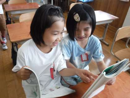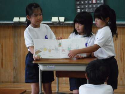国語科では、「くじらぐも」の学習が始まりました。作者は、中川 李枝子さんです。「ぐりとぐら」「いちねんせいのうた」の作者であることを知り、みんなとても関心をもって、本を読み進めています。今日は、本係さんが、みんなに読聞かせをしてくれました。