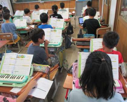 音楽科の学習で、「ゆかいな木きん」の曲で、鍵盤ハーモニカを演奏しました。リズムに合わせて、みんなでそろえて吹きました。