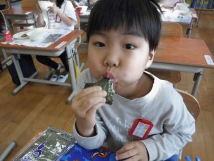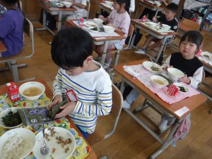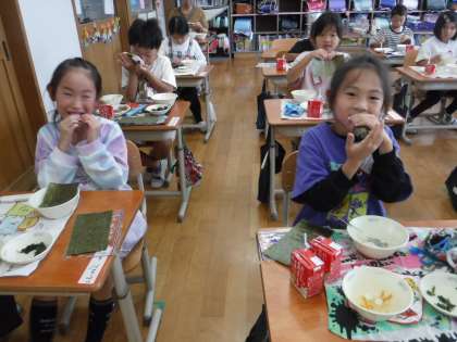 今日の給食は、ほうれん草のおかか煮、白菜の吉野汁、肉みそ納豆、手巻き海苔でした。肉みそ納豆と手巻き海苔は、1年生にとって、初めての献立です。「納豆のいいにおい。」「海苔で巻いて食べるのは、楽しいね。」と嬉しそうにいただいていました。