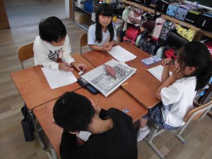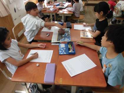 先週の生活科で収穫した、サツマイモを観察しました。触った感じを確かめたり、ものさしで大きさを測ったり、じっくり観察していました。どんな味がするのか、楽しみな様子でした。