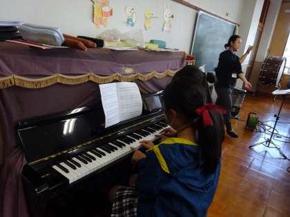 それぞれ担当の楽器を決めて、合奏の練習をしています。少し練習しただけでも、1フレーズ合わせてみると、とても迫力がありました。