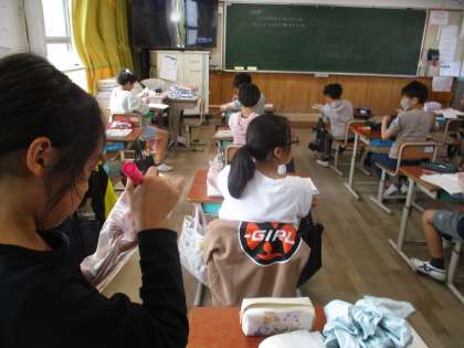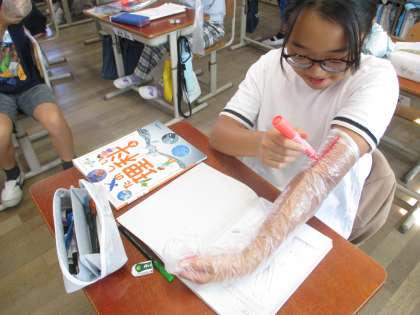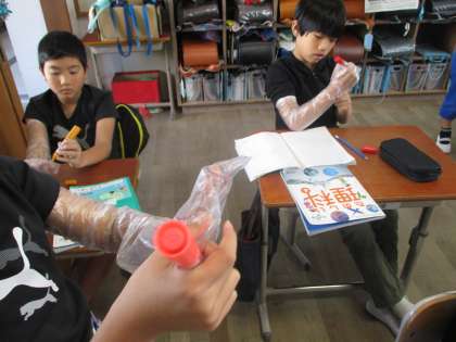 理科の学習で自分の腕のどこに骨があるかを調べました。ビニール袋を腕にはめて、骨があるところをマジックペンを使って書いて確かめました。