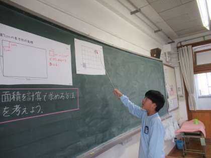 算数では、面積の学習に入っています。この日は1平方センチメートルの正方形がいくつあるか、ということをもとにして、面積の公式について考えました。公式を覚えるだけでなく、その意味をしっかり理解することができていました。
