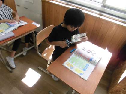 生活科の「あそんで、ためして、くふうして」の学習では、集めてきたものを使って、動くおもちゃを作りました。牛乳パックと輪ゴムで飛ぶおもちゃを作りました。その後は、箱とトレイを使って風で進むおもちゃも考えました。どういう仕組みなのか、どうしたら高く飛ぶのかなど、よく考えて作っていました。