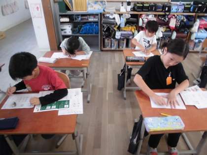 書写で漢字の学習を頑張っています。鉛筆の持ち方や姿勢もしっかり意識できる人が増えてきて、みんなどんどん字がきれいになってきています!