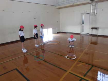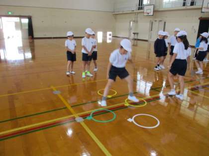 わっかを自分たちで工夫して並べ替えたコースを跳んだり、楽しく学習しています。