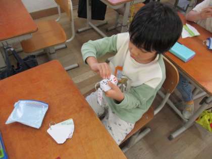 2学期が始まって、かけ算の学習をがんばっています。授業中や休み時間など、九九カードを使って何度も九九を唱えています。