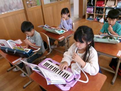 「どれみとなかよくなろう」では、けんばんハーモニカをふいています。