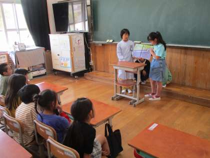 国語科の学習で、1年生に本を好きになってもらうために、本の読み聞かせをしにいきました。