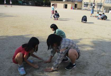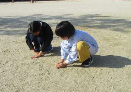 理科の学習で、日なたと日かげの温度の違いを運動場に確かめに行きました。