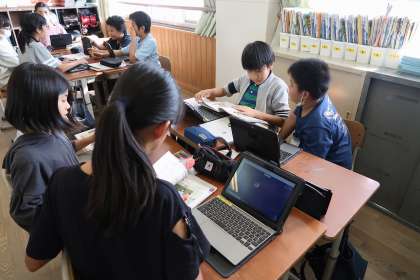 授業では、教職員にインタビューしたことを班でまとめて発表しました。