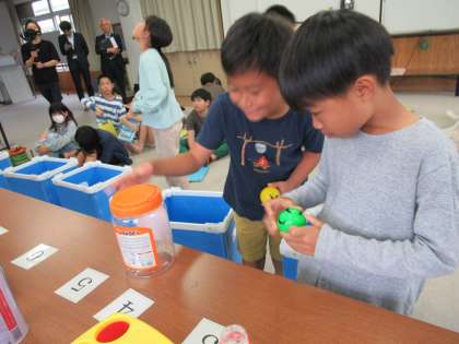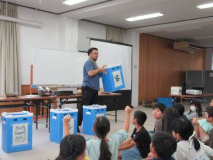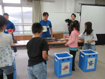 ごみの分別について、クイズ形式で教えていただきました。食器類や家電など、普段あまり扱うことがないごみはどう分類したらいいのか、悩みながらもよく考えていました。リサイクルできるものの種類も教えていただけたので、これからごみを捨てる時に生かしてほしいと思います。