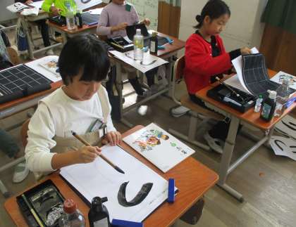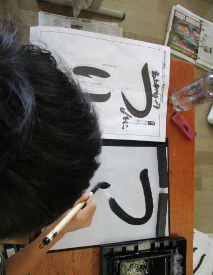2文字を半紙に書くのは初めてなので、バランスに気をつけて書いていました。