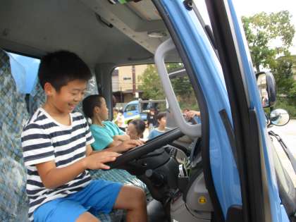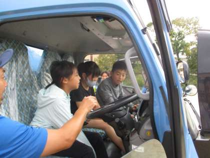 パッカー車の助手席・運転席に乗る体験もさせていただきました。家の車とは違ってとても大きかったり、たくさんのスイッチがあったりして、興味深く見ていました。
