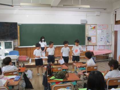 朝の会で毎日ニュース係が今日の天気や運動場で遊べるかをお知らせしてくれます。毎日ありがとう!!