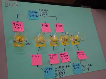 学習のまとめとして、水よう液あてクイズをしました。学習してきたことをもとに、自分たちで実験方法を考えて、実験をしました。片付けも安全に気を付けてすることができました。