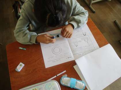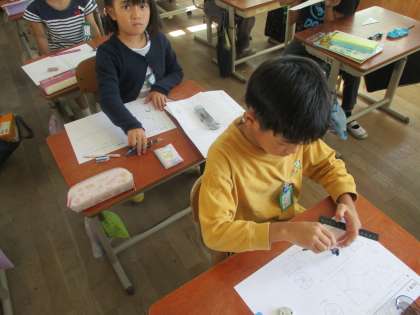 算数科の学習では、コンパスを使って円を描く練習をしています。