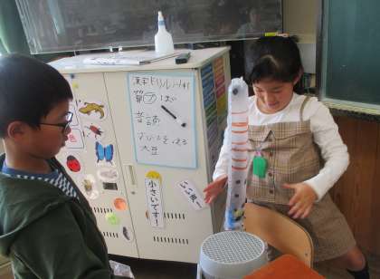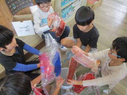 図画工作科の学習で、ビニール袋を使って作品を作りました。