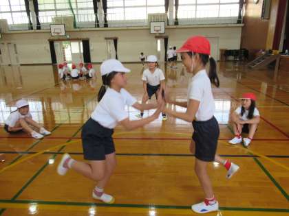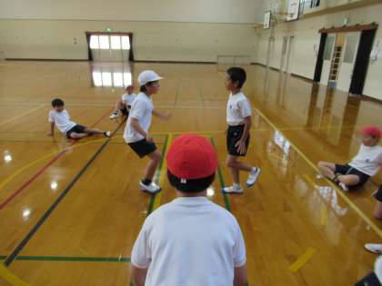 体育科のすもうあそびでは、けんけんずもうに挑戦しました。けんけんをしてバランスを取りながら相手と組み合うのは難しかったですが、チーム戦で行ったのでお互いに応援していてとっても盛り上がりました。
