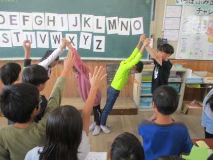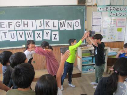 今回は、グループの友達と協力して、体を使って大文字を作り、クイズを出し合いました。