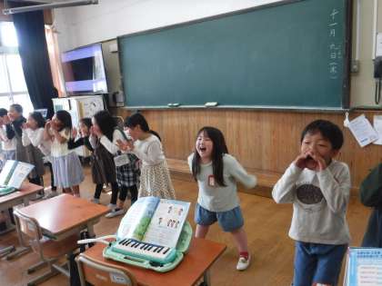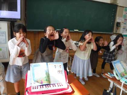 今、音楽科で大人気なのは、やまびこごっこです。2つのグループに分かれて、「やまびこ」の曲を輪唱します。本当に、山登りをしている気分になって、楽しく歌っていました。