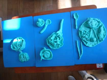 図画工作科で、自分が食べたいごちそうを粘土で作りました。「ごちそうって言ったら、やっぱりステーキでしょ!」「ハンバーグは、いつたべてもごちそうだよ。」と、友達とお話しをしながら作っていました。出来上がった作品を並べると、本当にパーティが始まりそうでした。