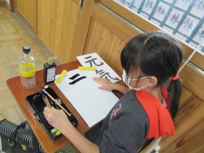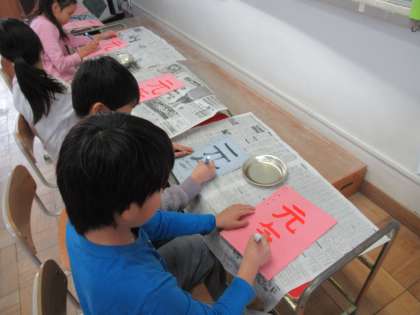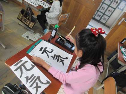 書写では、書き初めとして、「元気」を書きました。文字のバランスやはね方を特に気をつけました。水書シートでたくさん練習もしました。