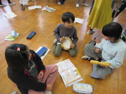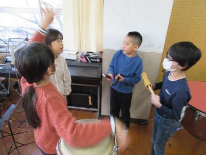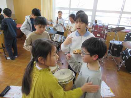 いろいろな打楽器を使って、鳴らし方を工夫しながら、グループで音を重ねて音楽づくりをしました。ボンゴやコンガ、小太鼓など、これまであまり演奏したことがない楽器に触れ、楽しみながら取り組んでいました。