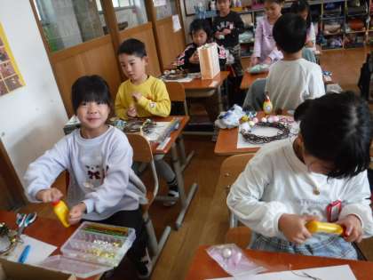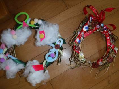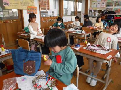 先週に作ったアサガオのリースに、飾りを付けました。家から持ってきたリボンやモール、ビーズだけではなく、生活科で見つけたどんぐりや松ぼっくりも飾りにしました。「サンタさんが見て、喜んでくれるかな。」と、とても楽しそうに作っていました。