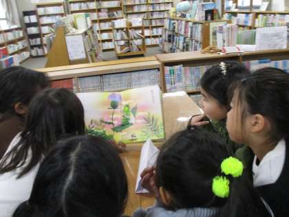 図書館で、学校司書の小池先生に読み聞かせをしていただきました。