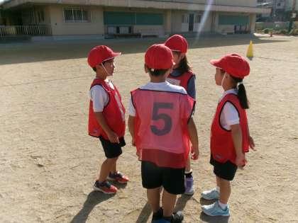 「ボールを山みたいに上に投げて取られないようにしよう。」「もらったらすぐパスしよう。」などチームごとに熱心に作成を立てていました。