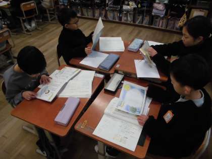 国語科の学習では、「詩の楽しみ方を見つけよう」をしています。「のはらうた」など、詩が載っている本を読み、お気に入りの詩を見つけました。お気に入りの詩は、どんなところがお気に入りなのかを友達に紹介します。