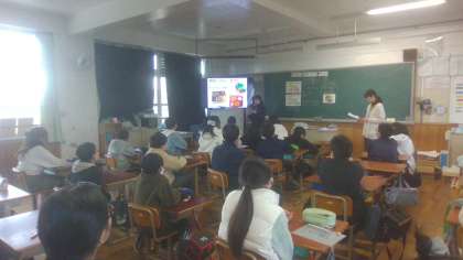 栄養教諭の平野先生や、中学校給食担当の先生から、中学校給食が届くまでや、栄養バランスについてお話を聞きました。