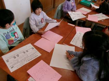生活科の「みんなのにこにこ大さくせん」では、家で見つけてきた家族のにこにこを報告し合いました。