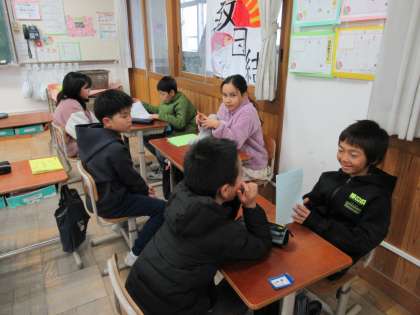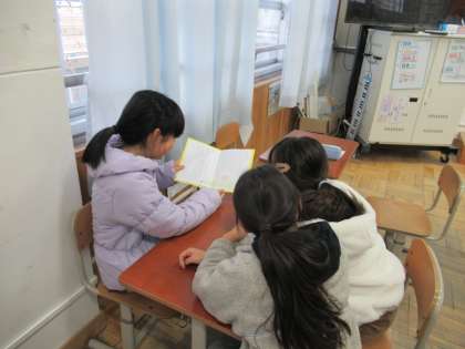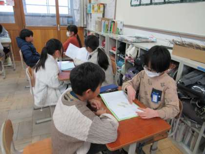 国語科では、詩集の中からお気に入りの詩を見つけ、テーマをもって集めた自分だけの詩集を作りました。写真は、その交流会の様子です。「○○のところがリズムが良くてお気に入りです。」など、選んだ理由まで説明することができていました。