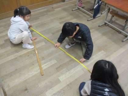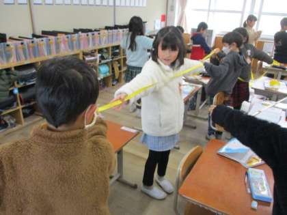 算数の学習で、100cmをこえる長さはどのくらいなのか、自分の腕の長さで測ってみました。みんなで紙テープを伸ばしながら楽しく測りました!